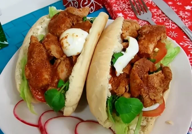 Each bite is an explosion of textures and tastes, where tender stewed chicken dances with crisp vegetables, creamy dressings, and the comforting embrace of pillowy bread.